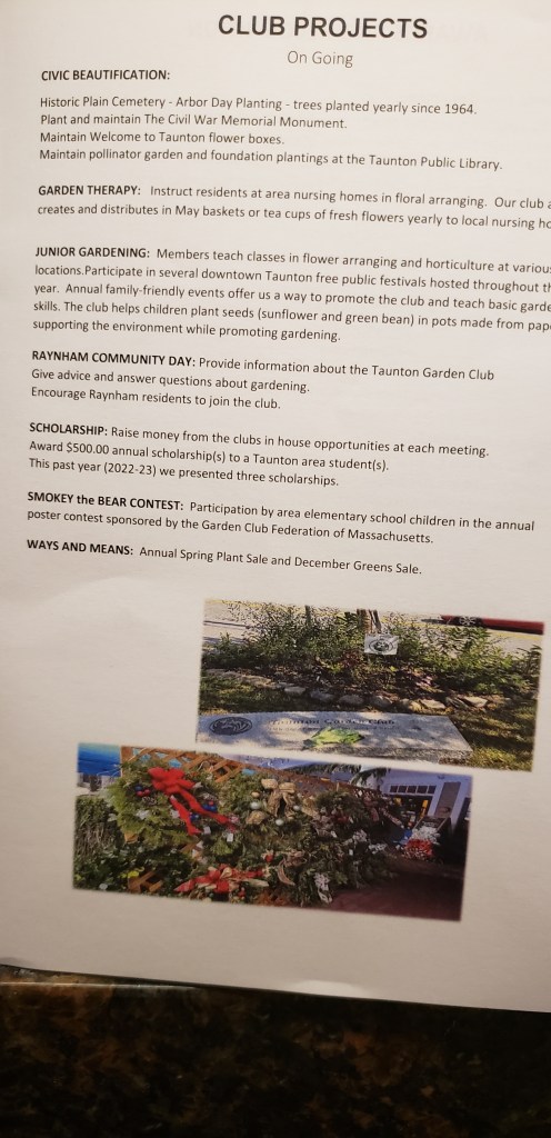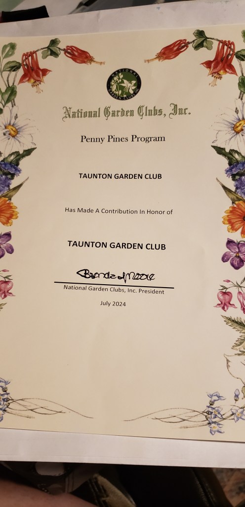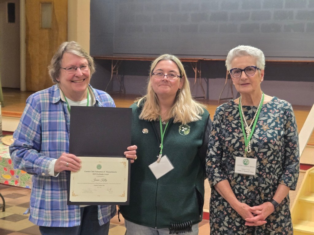 The Floribunda Rose is a hybrid rose that is densely packed with petals. Its Latin meaning is ” many flowering “. During our April meeting, our club which belongs to the Cranberry District of the Graden Club Federation of Massachusetts has awarded “The Floribunda Award of Appreciation” to our very own Jamie Kelly for her dedication to our organization and her ability to be ” many Flowering”. As our Horticulture’ Chairperson, she keeps us educated of ongoing environmental issues that affect our gardens. As the ‘Civic Beautification’ Chairperson she and her committee are maintaining and adding to Beauty of our City. On behalf of the club , she has taken on mentoring the THS garden club to help foster the next generation of Gardeners who will be environmentally aware. Congratulations Jamie and may you continue to use your Talents to be “many flowering” .